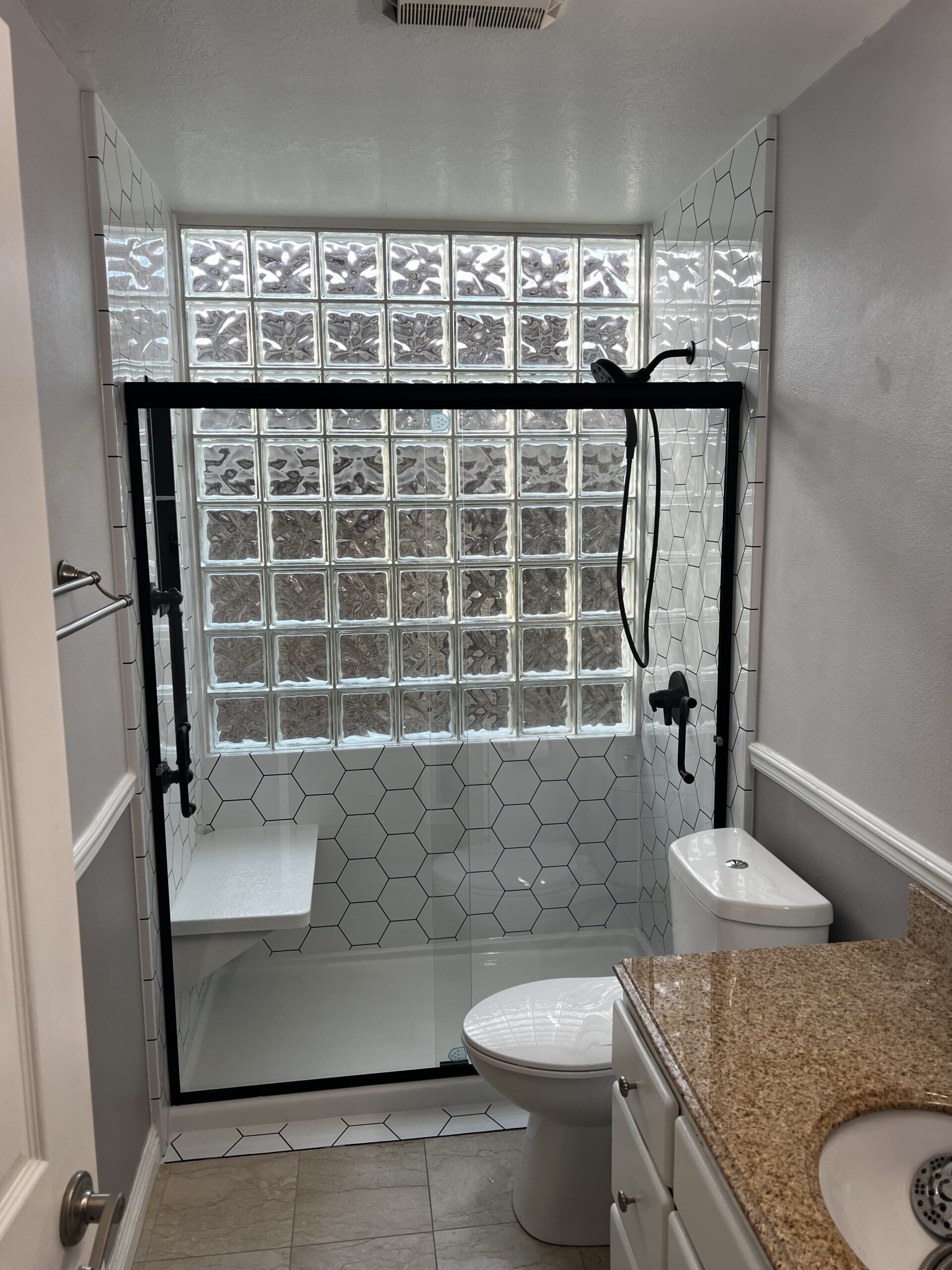 Our team has successfully completed yet another exceptional tub-to-shower conversion. The homeowners were no longer finding satisfaction with their existing tub, as it had become inconvenient, prompting their desire for a change with a sense of urgency. That’s when they reached out to us. Following thorough research and careful consideration of various reviews, they determined that our team was the most suitable for the job. What distinguishes us is not only the quality of our products but also our efficient one-day installation services. Our team has mastered the process, ensuring both expediency and precision. The homeowners were highly pleased with the final result, and so were we. The incorporation of honeycomb tiles and a glass partition with black frames added a modern touch that instantaneously revitalized the space. If you’re considering making substantial updates to your home’s bathroom this year, we encourage you to get in touch with one of our experts. We would be delighted to collaborate with you, formulate a plan, and initiate the process promptly. Give us a call at (855) 959-4328, or click here for a FREE estimate!